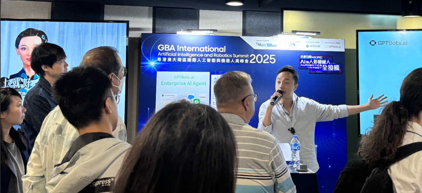 近日,GPTBots.ai作为参展方亮相于香港生产力促进局(HKPC)举办的粤港澳大湾区国际人工智能与机器人高峰会2025。此次盛会汇聚了全球AI领域的专家学者、行业领袖及创新企业,共同探讨AI与机器人技术如何赋能产业转型与高质量发展。
